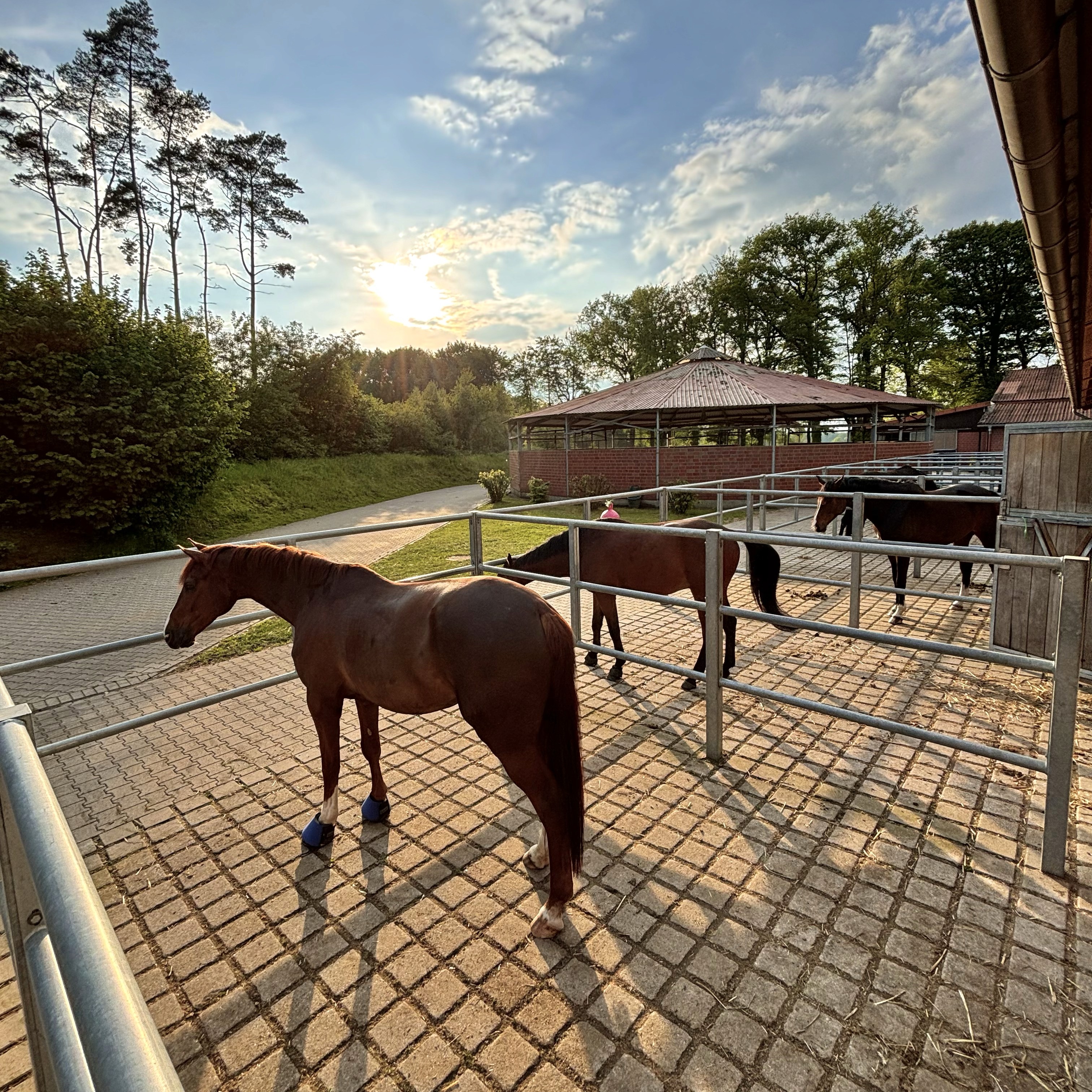 Unsere Anlage bietet eine erstklassige Ausstattung für Pferd und Reiter. Unsere zwei Reithallen mit den Maßen 20 x 80 Metern und 20 x 60 Metern ermöglichen ideales Training zu jeder Jahreszeit. Der Springplatz misst 50 x 70 Meter, der Dressurplatz ist 25 x 45 Meter groß, und beide Außenplätze sind mit einem Ebbe-Flut-System ausgestattet, das stets eine hervorragende Bodenqualität garantiert. Im Sommer genießen unsere Pferde stundenweise die großen Weiden, entweder in einer Gruppe von bis zu 10 Pferden oder, je nach Bedarf, auch zu zweit oder alleine. Im Winter können die Pferde alleine oder zu zweit auf den Paddocks stehen oder in einer größeren Gruppe die Winterweide nutzen, um auch in der kalten Jahreszeit frische Luft und Weideleben zu genießen. Zudem steht eine Führanlage zur Verfügung, die Platz für bis zu 8 Pferde bietet und nach Wunsch im Service mitgebucht werden kann.
